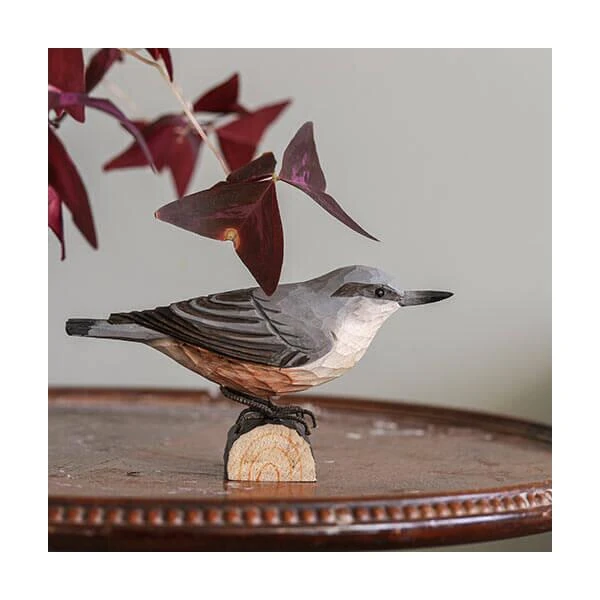 Ambachtelijk vormgegeven houten boomklever (Sitta europaea). De boomklever wordt op ware grootte weergegeven en is beschilderd met milieuvriendelijke verf