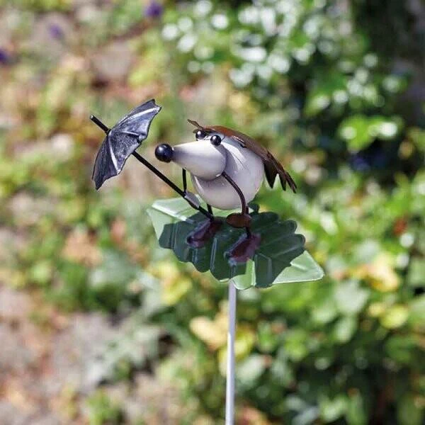Blaas nieuw leven in jouw tuin, terras of balkon met deze originele tuinprikkers. Bovenaan pronken twee schattige egeltjes, de ene draagt een bloem bij zich en de andere egel een paraplu. Beiden staan ze te balanceren op een blad dat met de wind meebeweegt.