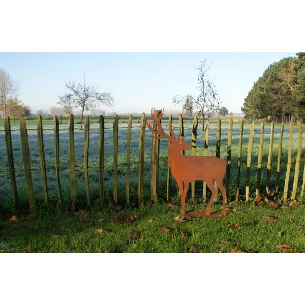 Het prachtige beeld is gemaakt uit speciaal gevormd en behandeld metaal met een roestige look. Met de voorziene stevige basis kan je het hert zowel binnen als buiten een plekje geven.