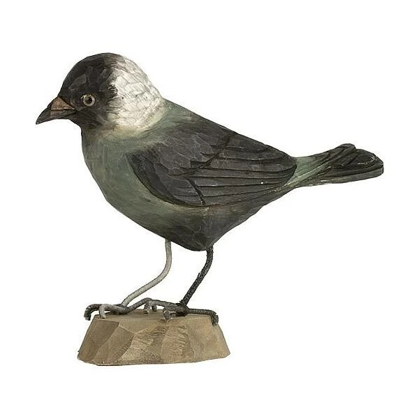 Ambachtelijk vormgegeven houten kauw (Corvus monedula). De kauw wordt op ware grootte weergegeven en is beschilderd met milieuvriendelijke verf. Deze grote antraciet gekleurde zangvogel is door velen geliefd en gehaat. Deze nieuwsgierige kraaiachtige heeft een zwartgrijs verenkleed en een zilvergrijs achterhoofd.