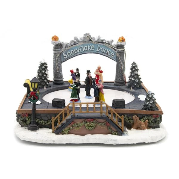Op het Snowflake Dance pleintje in het park dansen vier koppels op de maat van de muziek en volgens de instructies van de man in het midden. Op het pleintje staan kerstbomen die bedekt zijn met een laagje sneeuw en aan de trap hangen feestelijke guirlandes.