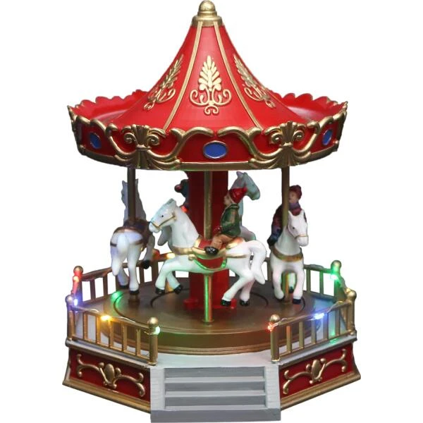 De vier paarden draaien rond terwijl de kinderen dolle pret hebben en wuiven naar hun ouders. Led lichtjes in verschillende kleuren aan de ballustrade maken het tafereel extra feestelijk. Op de achtergrond speelt een vrolijk kerstliedje.