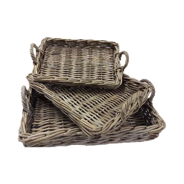 Mooie set van 3 in elkaar passende plateaus of dienbladen. Elke mand is vervaardigd uit riet en heeft op de uiteinden een handvat waardoor ze makkelijk te verplaatsen zijn.