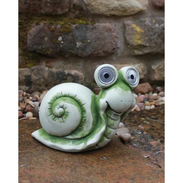 Deze grappige slak is een leuke tuindecoratie die met zijn verlichte ogen voor de nodige sfeer zorgt op het terras, bij de vijver of in de rotstuin. De grote ogen van de slak zijn twee led lampen die bij schemering oplichten.