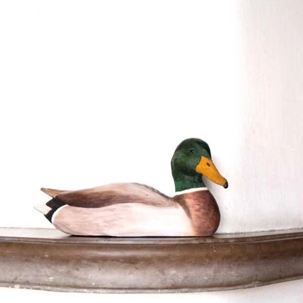 De wilde eend is een veel voorkomende watervogel die je voortaan ook in het hout in de tuin of in de woonkamer kan plaatsen. Met zijn groene kop en gele snavel is dit houten beeld een streling voor het oog.