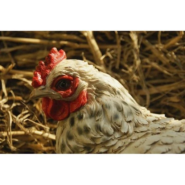 Prachtig levensechte weergave van een zittende kip. Mooi beeld vervaardigt uit duurzaam kunsthars geschilderd als een echte witte legkip